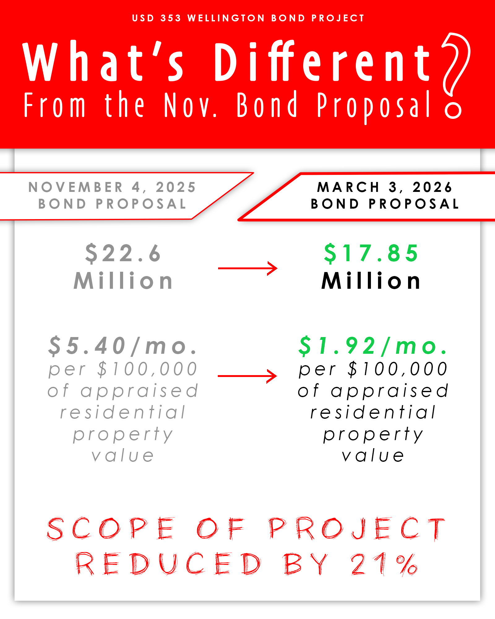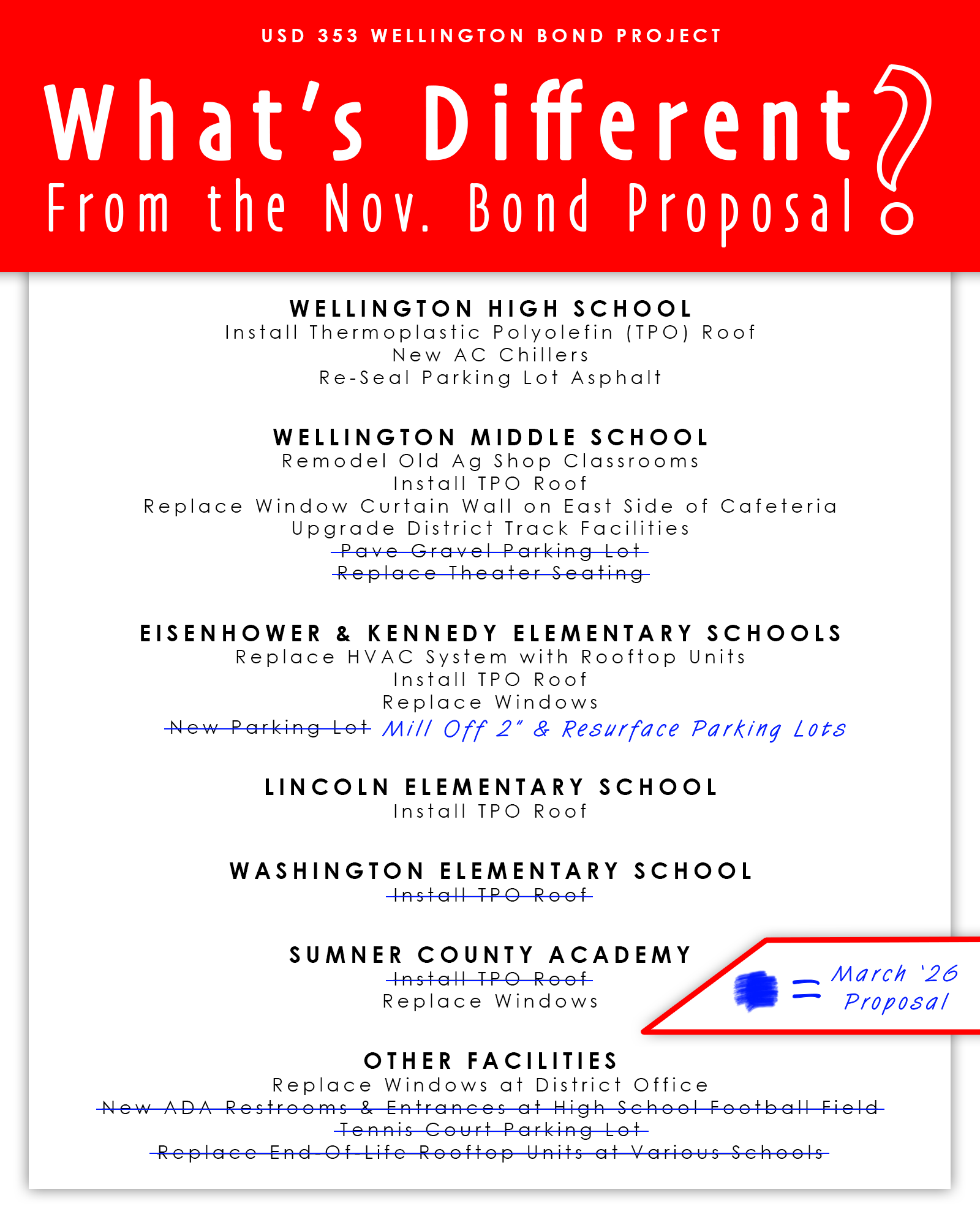 WELLINGTON, KS — The USD 353 Board of Education has officially called for a special bond election on March 3, 2026, presenting a revised proposal that directly responds to community feedback following the November 4 general election. The new proposal is a significantly scaled-back version of the previous measure, focusing exclusively on the district’s most urgent facility needs and deferred maintenance.