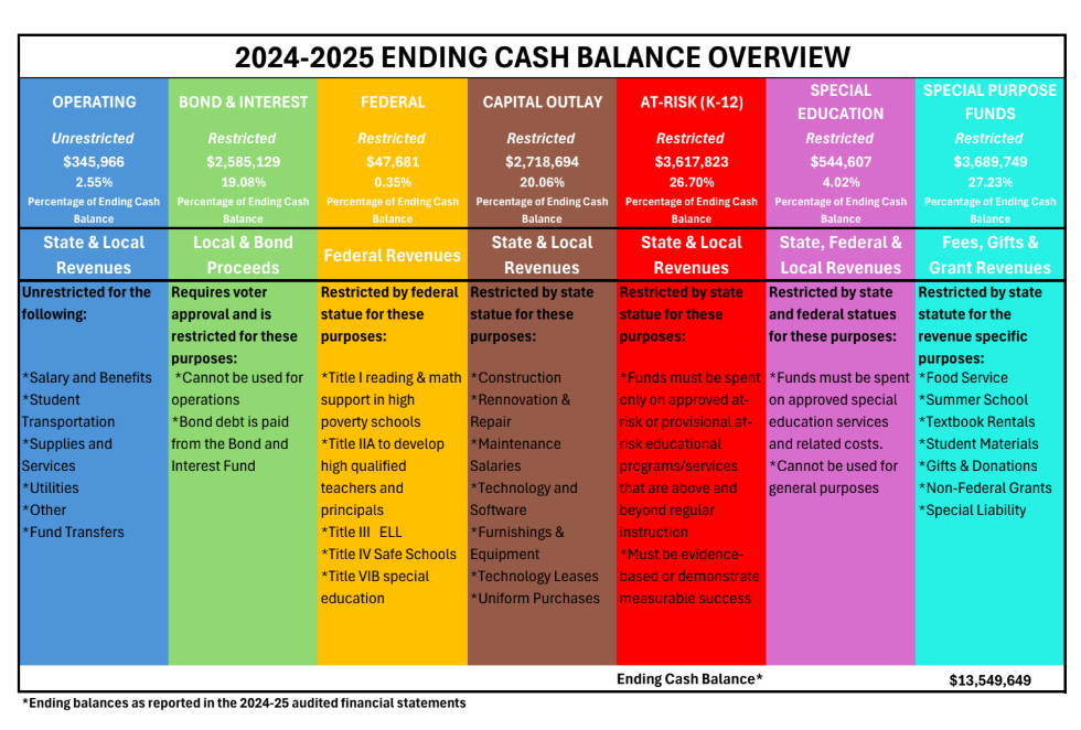 For a brief explanation of each of the funds or "buckets" and their spending restrictions in the district's ending cash balance after Fiscal Year 2024-2025, view the 2025 Cash Balance Overview.